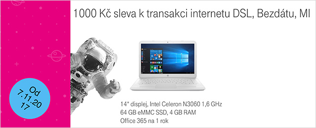 Pokud uzavřete nebo prodloužíte smlouvy na Pevný internet (vedený přes kabel), Internet bez drátu nebo Mobilní internet od 7.11. do konce roku 2017, můžete mít notebook HP Stream 14 za výbornou cenu 6 199 Kč, tedy o tisícovku levněji. Pokud tolik dohromady nedáte, můžete si vzít notebook i na splátky bez navýšení za 219 Kč jednorázově a pak 23x260 Kč.