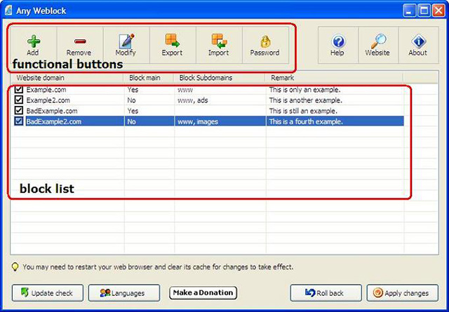 Any Weblock je program, který umožní blokování jakýchkoliv internetových stránek na vašem počítači. Program spolupracuje se všemi webovými prohlížeči. Pro nastavení blokace stačí pouze zadat doménu a blokují se i všechny subdomény. Program můžete zaheslovat, aby nikdo neměl možnost ho přenastavit.