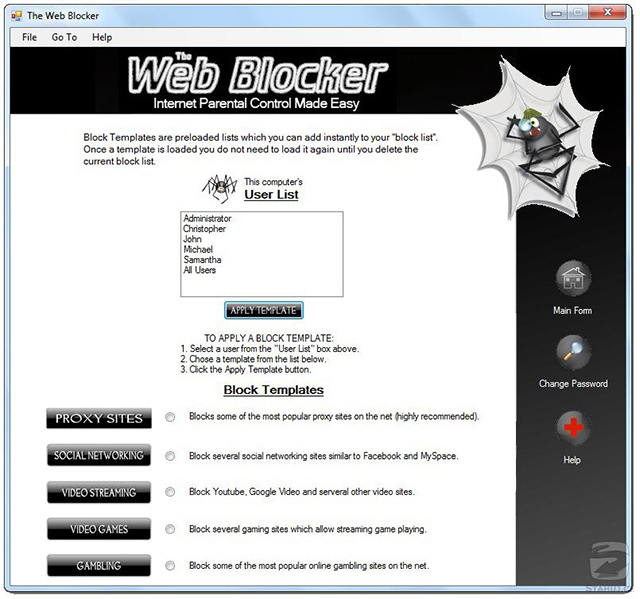 Stejně slouží i The Web Blocker. V programu máte možnost filtrovat obsah stránek, například obsah pro dospělé a další. Program také umožňuje prohlížení internetové historie.