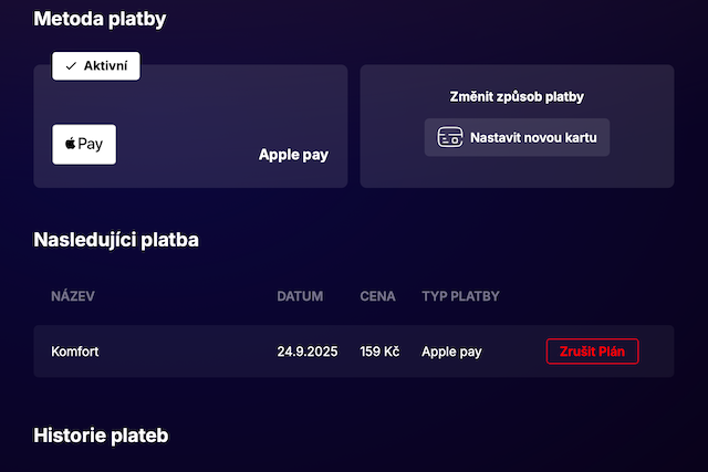 Pokud máte Oneplay přes Novu a chcete své předplatné zrušit, může se stát, že tlačítko Zrušit plán v sekci Následující platba nemáte. V takovém případě zvolte změnu plateb, klikněte na Změnit platební kartu a vraťte se zpátky. Následně by se vám tlačítko Zrušit plán mělo ukázat.