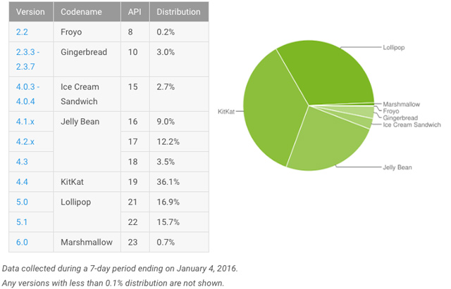 Největší zastoupení má stále 3 generace starý KitKat s 36,1 %. Lollipop má celkově 32,6 %, což je nepatrně více, než v minulém měsíci. Marshmallow, který se již pomalu objevuje v nových zařízeních nebo coby aktualizace u starších, poskočil z 0,5 na 0,7 %.