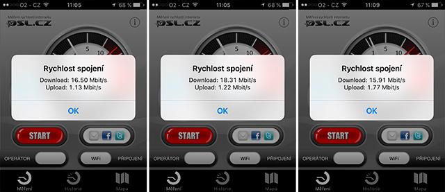 Na mobilní alikaci DSL.cz se mi dařilo průměrně stahovat podobnou rychlostí 16,9 Mb/s,