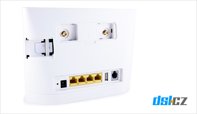 Na zadní straně modemu se po vycvaknutí boční krytky nalézá již výše jmenovaný slot na SIM kartu a za největší krytkou uprostřed najdete na dva konerkory pro externí antény, které zajistí zvýšení mobilního signálu.