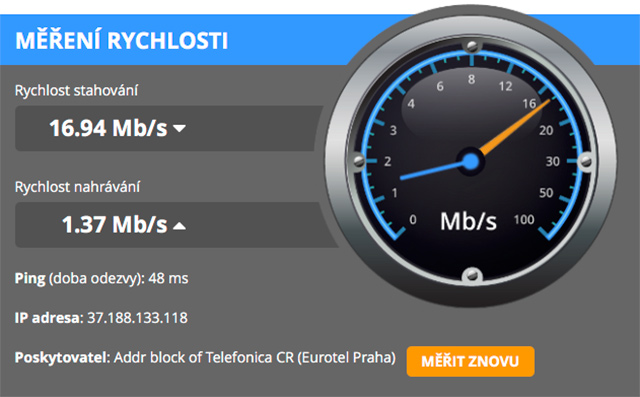 Rychlost internetu jsem sama testovala na několika místech v Praze, modem vždy ukazoval připojení přes LTE. Při měření v bytě o velikosti zhruba osmdesát metrů jsem postavila modem na okno, rychlost se průměrně pohybovala okolo 15 Mb/s pro download a upload byl okolo 2 Mb/s při pingu 30 ms. Kousek za hranicí Prahy jsem naměřila download 18.59 Mb/s a upload okolo 5 Mb/s při pingu 36 ms. Ve stejnou dobu jsem měřila také rychlost svého trvalého připojení doma a to dosahovalo rychlosti 8.59 Mb/s pro download a 0.51 Mb/s pro upload při pingu 33 ms. Měření jsem prováděla několik dní po sobě v časovém rozmezí zhruba od 14. do 16. hodin.