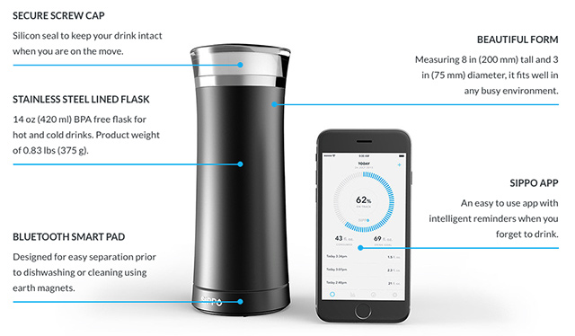 Další láhev, která vám doporučí individuální denní harmonogram na základě vašich činností a postará se o to, abyste vypili optimální množství tekutin je láhev Sippo. Aplikace k láhvi hlídá vaši hladinu hydratace a doporučí vám plán, jak dosáhnou ideální hydratace po celý den. K dostání je 420 mililitrová láhev v černé a modré barvě za 59 dolarů.