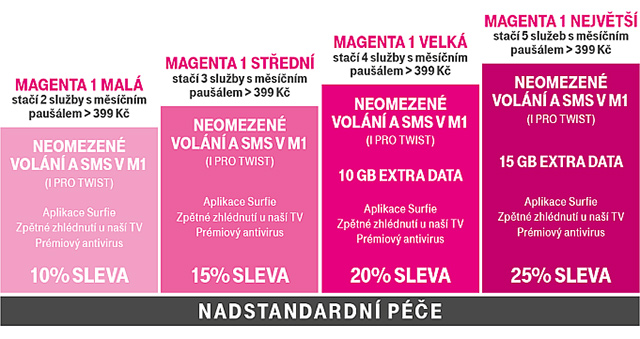 Dohromady lze spojit maximálně 9 služeb, minimálně pak 2, z nichž u každé musíte měsíčně platit alespoň 399 Kč. Podle toho se pak zařadíte do úrovně Magenty. Celkově se sleva za každou službu může pohybovat v rozmezí od 10 do 25 %. Za spojení 4 služeb pak získáte 10 GB mobilních dat navíc a za spojení 5 a více služeb dokonce 15 GB.