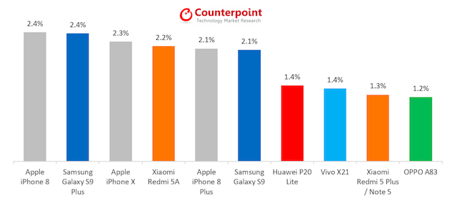 Podle nejnovějších zveřejněných dat je nejprodávanějším telefonem iPhone 8. V těsném závěsu je Samsung Galaxy S9 Plus a dá se očekávat, že se budou tito dva favorité neustále dohánět a první příčky si střídat.