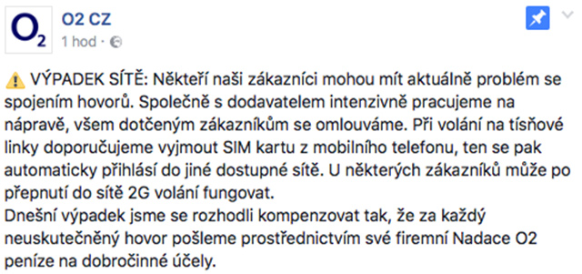 O2 se rozhodlo dnešní výpadek kompenzovat tak, že za každý neuskutečněný hovor pošle prostřednictvím své firemní Nadace O2 peníze na dobročinné účely.