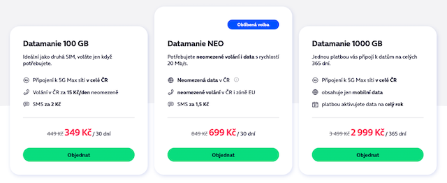 S Datamanie 100 GB můžete volat v ČR neomezeně za 15 Kč denně a posílat SMS za 2 Kč. Datamanie NEO zahrnuje neomezená data v Česku a neomezené volání v ČR i EU, SMS stojí 1,50 Kč. Datamanie 1000 GB ovšem obsahuje jen mobilní data.