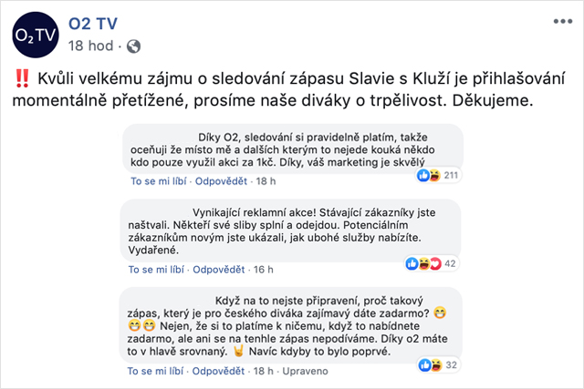 V úterý odehrála v rámci 4. předkola Ligy mistrů pražská Slavie utkání s rumunskou Kluží. Zákazníky O2 TV, kteří si chtěli tento zápas zapnout, ale čekalo zklamání. Vysílání kvůli velkému zájmu znovu vypadlo.