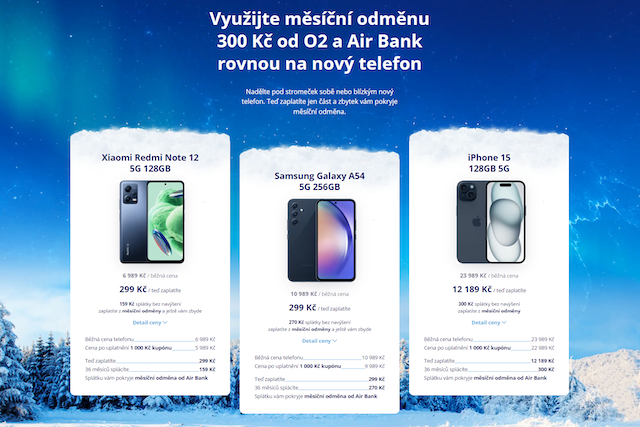 O2 odhalilo vánoční nabídku telefonů, které si můžete pořídit i na splátky bez navýšení. Splátku vám přitom pokryje odměna za využívání služeb O2 a AirBank.