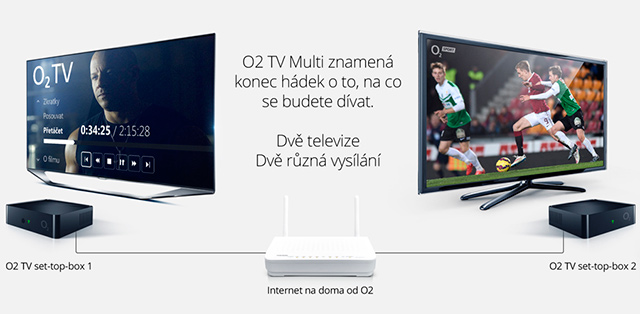 Pokud máte v domácnosti 2 televize a na každé chcete sledovat v jeden okamžik jiný kanál z O2 TV, tak potřebujete O2 TV Multi. Potřebujete 2 set-top-boxy a k stávajícímu tarifu O2 TV jste až do včerejška platili navíc 50 Kč měsíčně. Od 15.9.2015 za setejnou službu zaplatíte 100 Kč měsíčně.