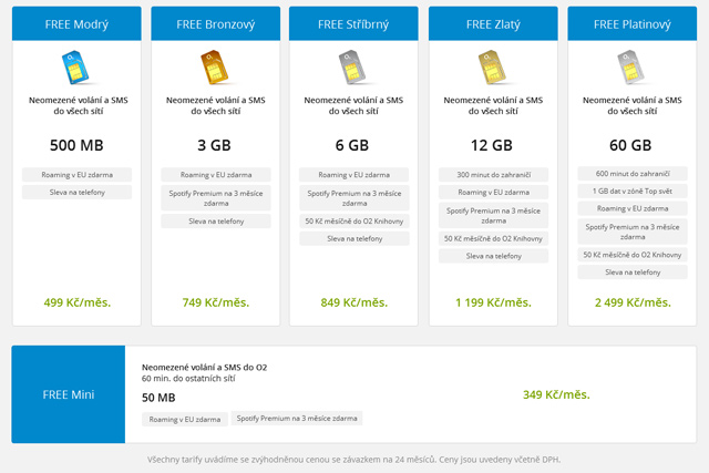 Šest tarifů změní své dosvadní názvy. Zůstává jenom název Free, jinou se budou jmenovat podle toho, kolik dat obsahují. O2 ale využije ke znázornění i barvy nebo přirovnání ke kovu.