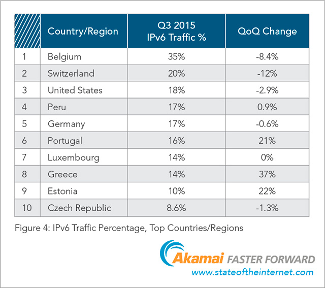 V TOP 10 je Česká republika také mezi zeměmi s nejvyšším podílem provozu v síti IPv6. Podle zprávy Akamai už nový protokol zajišťuje v ČR přenos 8,6 procenta všech dat.