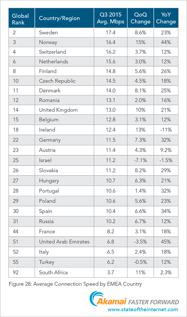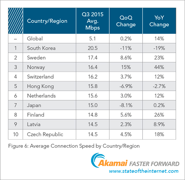 Průměrná rychlost internetu na celém světě je pouhých 5,1 Mb/s. Ve srovnání se stejným obdobím roku 2014 se ale jedná o 14 % zrychlení. Česká republika, která má desáté místo v pořadí, má průměrnou rychlost internetu 14,5 Mb/s., což je o 18 % více než o rok dříve. Nejrychlejší internet na světě má Jižní Korea s průměrem 20,5 Mb/s, což je ale o 19 procent méně než před rokem. Další tři pozice obsadily evropské státy v čele se Švédskem.