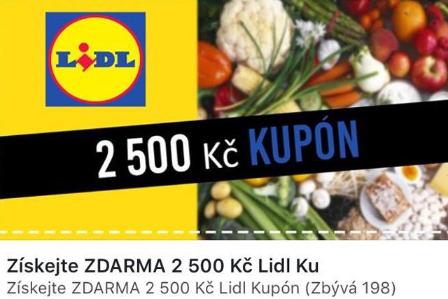 Na sociálních sítích, především na Facebooku, se začala objevovat nabídka na slevový kupón ve výši 2 500 Kč do obchodního řetězce Lidl, jedná se však o podvod.