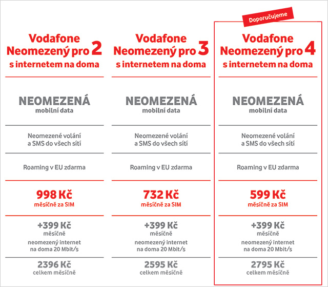 Neomezený tarif pro 2 vyjde na 998 Kč na osobu, pro 3 účastníky je cena 732 Kč za osobu a Vodafone Neomezený pro 4 bude stát 599 korun měsíčně za jednu SIM.