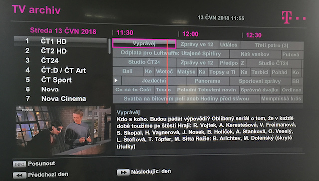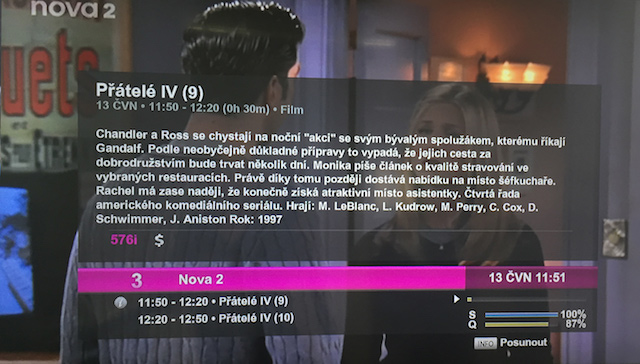 K informacím o TV programu se dostanete po zmáčknutí tlačítka i neboli INFO. Pak uvidíte ve spodní liště, co právě sledujete a co vás čeká. Oceňujeme možnost rychle se podívat, co už v TV běželo a co teprve poběží. Když zmáčknete i podruhé, zobrazí se vám detailnější popis pořadu, na který se díváte. A opět: detailnější přehledy se budou rozkrývat, když pojedete šipkami doleva i doprava.
