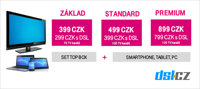 Samostatnou televizi pořídíte za 399 Kč, za 100 TV kanálů zaplatíte 499 Kč a 130 programů můžete sledovat za 899 Kč. Každý klient, který si T-Mobile TV aktivuje do konce června, získá ještě speciální akční výhodu: 100 Kč slevu na měsíční paušál a balíček HBO Základ na půl roku jako dárek. Uživatelé DSL internetu od T-Mobile mají tarify ještě výhodnější.