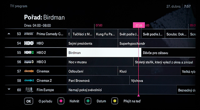 Ovládání televize mi přišlo celkem jednoduché. V hlavní nabídce najdete TV kanály s televizním programem na jaký jsme zvyklí u většiny televizí. Přejet se dá až o 48 hodin zpět a podívat se tak můžete na pořady, které vám unikly.