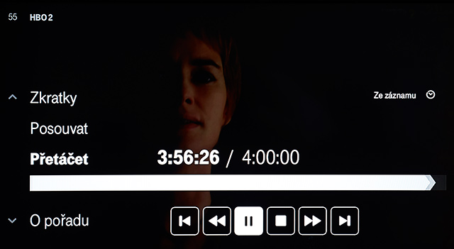 Co bych vytkla je přetáčení v módu zpětného sledování. Při posouvání pořadu nevidíte na obrazovce průběh přetáčení. Vidíte pouze čas. Musíte tedy odhadovat, kde se asi zrovna nacházíte. Uvítala bych, kdybych viděla zrychlený obraz a poznala bych tak, kdy přetáčení zastavit. Když jsem chtěla přetáčet reklamy, pěkně mě štvalo, že jsem neviděla kdy končí.
