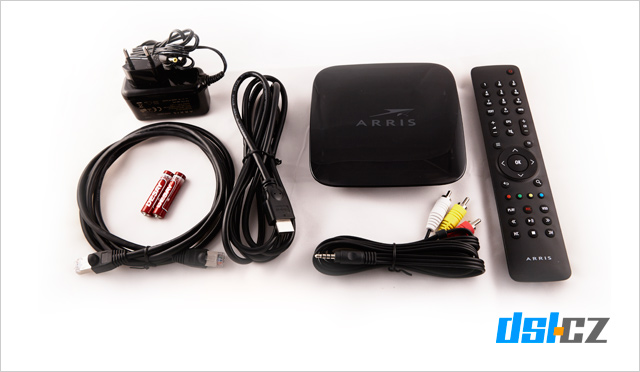 V balení naleznete malý, černý set-top-box Ariss VIP113M, HDMI kabel, AV/RCA kabel, ethernetový kabel, napájecí zdroj k set-top-boxu a ovladač s bateriemi.