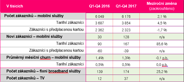 Co se týče mobilního trhu, k poslednímu dni roku 2017 měl T-Mobile skoro 6,2 milionů zákazníků. Více než 3,8 milionu bylo zákazníky tarifními a 2,3 milionu si vybralo předplacené služby. Nejoblíbenější byly tarify Mobil M a Mobil S, které odpovídají na velký zájem o data.