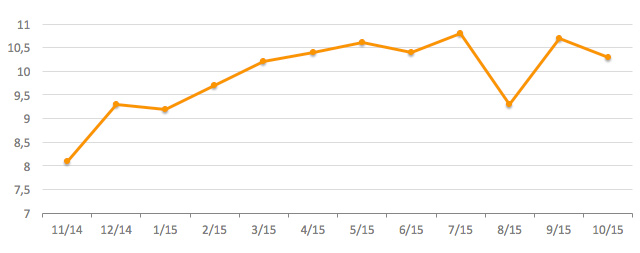 Na grafu vidíte vývoj rychlostí Wi-Fi internetu v České republice za posledních 12 měsíců. V říjnu se rychlost Wi-Fi internetu oproti září lehce snížila. Naměřili jsme průměrnou rychlost stahování 10,34 Mb/s, což je o 3% méně.