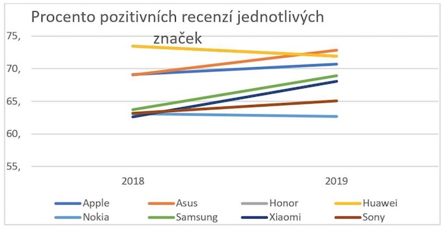 V současnosti si obě značky drží spokojenost kolem 70 %. Po Samsungu a Applu následují telefony značky Huawei a Google. Největší podíl pozitivních recenzí má ale překvapivě Asus.