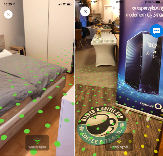 Po nainstalování aktuální verze aplikace zvolíte u položky Wi-Fi a síť možnost Změřit pokrytí Wi-Fi. "Poté už se v aplikaci O2 Smart Box objeví okno, ve kterém je reálný obraz snímaný fotoaparátem telefonu. Přímo v konkrétních místech bytu se na displeji chytrého telefonu či tabletu zobrazuje v reálném čase pole virtuálních kuliček, jejichž barva signalizuje kvalitu Wi-Fi pokrytí," popisuje Bacík s tím, že červená značí špatnou a zelená naopak skvělou dostupnost.
