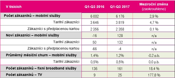 Fixní služby: Jen pro rekapitulaci: v září T-Mobile podstatně zjednodušil a zlevnil nabídku pevného internet. Už na začátku roku 2017 zařadil do své nabídky služeb i pevné připojení vzduchem, tedy přes mobilní síť. Přes kabel (neboli přes xDSL technologii) k tomuto dni funguje kolem 161 000 zákazníků.