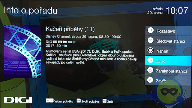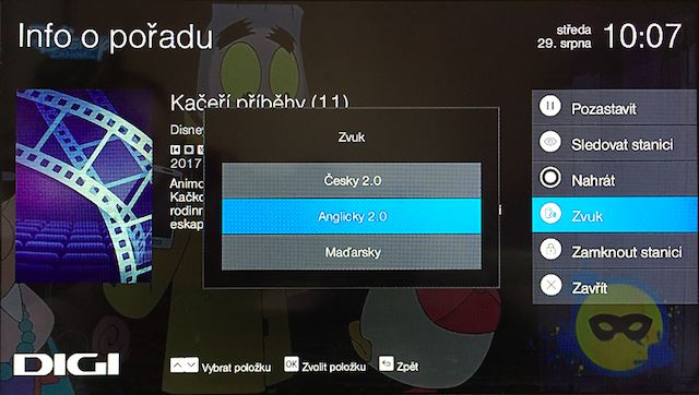 Potom, co si v IPTV (většinou stisknutím OK) necháte zobrazit info o dětském pořadu, uvidíte řadu malých ikonek. Mezi nimi je i mluvící panáček. Pokud je v barvě, znamená to, že je pořad k dispozici i v jiném jazyce. Pak přes EPG zvolíte rozsáhlejší info o pořadu a vyberete si jazyk. Takovou pohádku ale musíte chvíli hledat. Nejčastěji narazíte na vysílání v angličtině u amerických pohádek, ale chce to trpělivost. To platí o všech dětských programech.