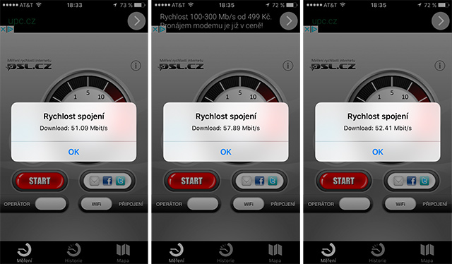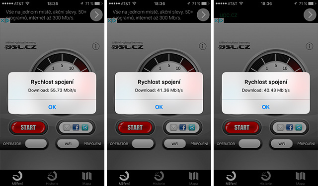 Rychlost jsme samozřejmě změřili na našem měřáku. Průměrná rychlost připojení je kolem 50 Mb/s. Pokud se vzdálíte od stojanu dál, rychlost klesá na 20 Mb/s, potom se ovšem připojí na další stojan a opět roste. Připojit se může až 250 uživatelů.