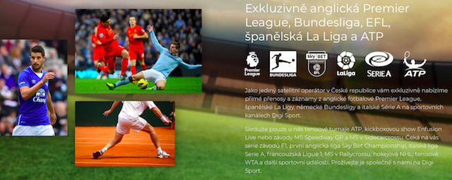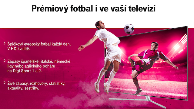 | Digi TV | Základ+SPORT PLUS | LaLiga, Bundesliga, Série A, FA Cup, PremierLeague | 349 Kč +159 Kč | V tarifu MAXI za 849 Kč máte o dost víc super programů pro celou rodinu |
