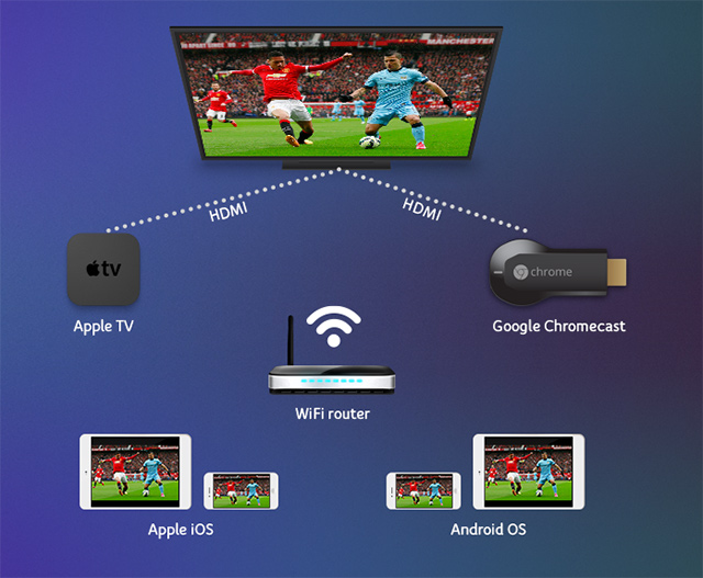 Mobilní televize Horizon Go bude možné sledovat i na větších obrazovkách. Stačí propojit prostřednictvím zařízení Chromecast nebo Apple TV s televizí s HDMI vstupem.