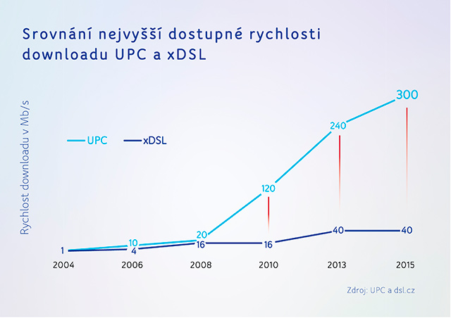 Podle plánů Evropské unie by každá domácnost měla mít do roku 2020 přístup k internetu o rychlosti minimálně 30 Mb/s a polovina domácností minimálně 100 Mb/s. Nové rychlosti internetu od UPC aktuálně dosahují až 300 megabitů. Ve srovnání s nejvyšší rychlostí xDSL linek překonává UPC rychlost více než sedmi násobně.