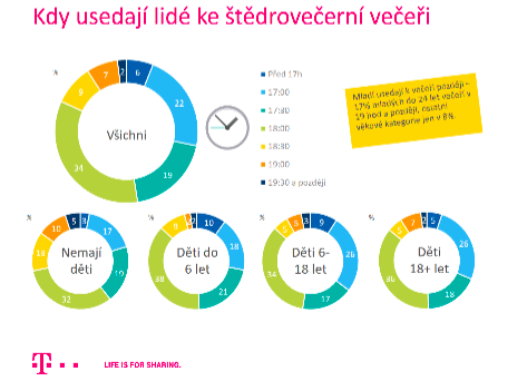 V pondělí tři čtvrtiny z nás zasednou ke štědrovečerní večeři mezi 17. a 18. hodinou, 34 % pak večeří přesně v 18:00, 6 % lidí pak, nejčastěji kvůli nedočkavým dětem, usedne k večeři už před 17. hodinou. Po 18. hodině většinou jedí páry bez dětí.
