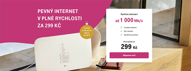 Pokud si plánujete pořídit pevný internet od T-Mobilu, můžete až do konce prosince využít akci, díky které budete prvních 6 měsíců platit jen 299 Kč. Ušetříte tak až 60 % z původní částky.