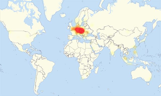 Mapa na downdetector.com ukazuje, že výpadek se kromě Česka týkal i některých území na Slovensku, v Německu, Rakousku, Polsku, Maďarsku, Slovinsku, ale i na východním pobřeží USA.