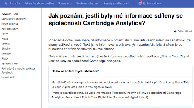 O tom toho najdete na internetu spousta. Jak ale zjistit, jestli vaše data opravdu někdo zneužil nebo ne? Stačí se přihlásit k Facebooku a v jeho informačním kanálu najít stránku reportující o tom, jestli se byla vaše data dána všanc. Stránka má název Jak poznám, jestli byly mé informace sdíleny se společností Cambridge Analytica?