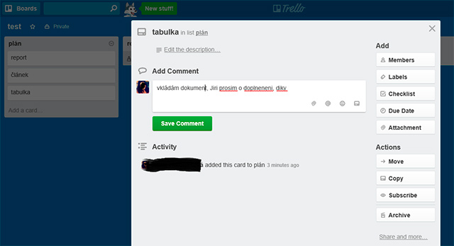 Navíc do okna mi kdokoliv z kolegů, kteří mají do Trella přístup, mohou článek komentovat. Někdo mě může na něco upozornit někdo jiný přidat fotografie. Nic z toho se neztratí, protože je to uloženo u jednoho a toho samého článku od začátku až do konce. Vyhnete se tím nekonečným e-mailům, ve kterých se po chvíli všichni začnou ztrácet.