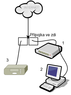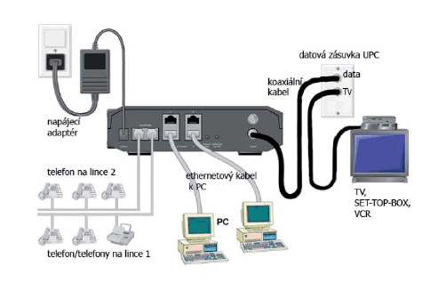 Zapojení CATV: Do přípojky je koaxiálním kabelem připojen modem (1), do modemu ethernetovým kabelem počítač (2). Dalším koaxiálním kabelem je do přípojky zapojen set-top box (3) pro digitální kabelovou televizi.