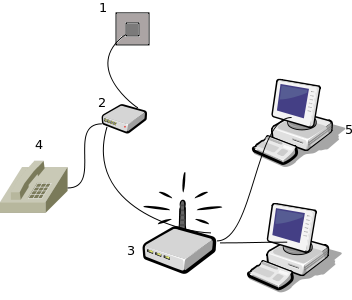 Zapojení ADSL/VDSL v praxi: 1 - telefonní zásuvka, 2 - rozbočovač, 3 - ADSL/VDSL modem kombinovaný s WiFi routerem, 4 - telefon, 5 - klientské počítače