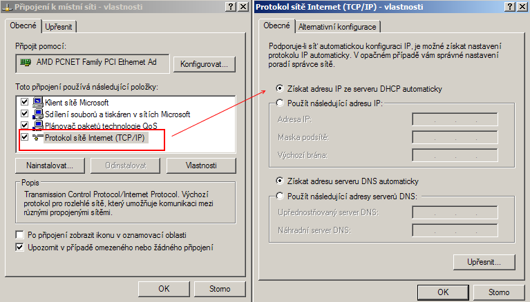 Když nebude internetové spojení fungovat, podívejte se do nastavení síťové karty v počítači. Klikněte na tlačítko StartOvládací panelySíťová připojení, poklepejte pravým tlačítkem na síťovou kartu → Vlastnosti a na první kartě uvidíte v seznamu položku "Protokol sítě Internet (TCP/IP)", dvakrát na ni klikněte a ujistěte se, že je zatržena možnost "Získat adresu IP ze serveru DHCP automaticky" a "Získat adresu serveru DNS automaticky".