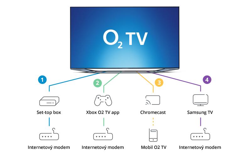 Na O2 TV se můžete dívat přes set-top box, Xbox, Google Chromecast nebo přímo v televizích Samsung a LG. Pokud si vyberete první možnost, budete potřebovat set-top box od O2, který lze zakoupit jednorázově nebo na splátky.